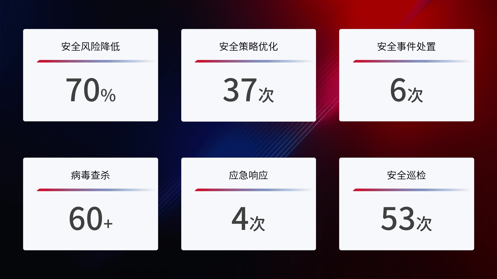 提供全面的安全事件报告体系,,,包括处置报告、、、、周报、、、季度和年度总结,,,结合持续监控,,,帮助客户深入了解网络安全状况。。