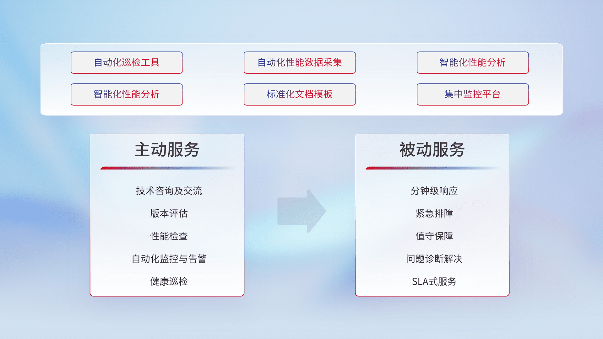 智能化工具和标准化文档,,保障服务质量,,,,提供主动服务(包含技术咨询、、、、版本评估、、性能检查、、自动化监控与告警、、健康巡检)和被动服务包含(分钟级响应、、紧急排障、、、值守保障、、问题诊断解决、、SLA服务)。。